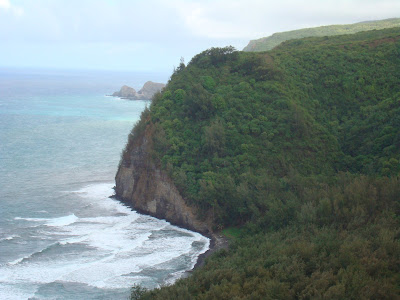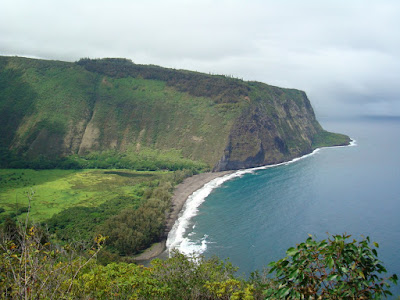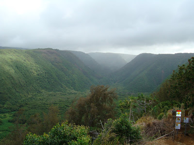 From Waimea, we headed West back to the coast and then took the coast road north and then east. After going through a couple of towns and then the country side featuring several one lane bridges and switchbacks, we arrived at Pololu Valley Lookout. Words can’t describe this place, other than to say that the green of the valley and the cliffs of the beach reminded me of my trip to Ireland. There was a trail down the overlook to the beach and it appeared to be very steep. Two hikers took up the challenge and were heading down as we left.