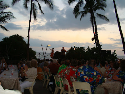 The wedding was held on a lagoon overlooking the ocean and finished quickly, ending on cue just before a rain shower. The luau at Royal Kona Resort also served as the wedding reception and drinks were flowing. The luau mai tais were watered down so several trips were made to the hotel bar for stiff mai tais and cold Big Waves.