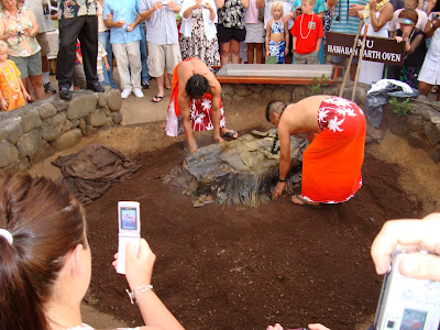 Soon it was time for the ceremonial unveiling of the pig, which had been cooking in the Imu (Hawaiian Earth Oven) for eight hours. The pig was cooked perfectly, as it fell apart when it was removed from the oven and hit the serving table.